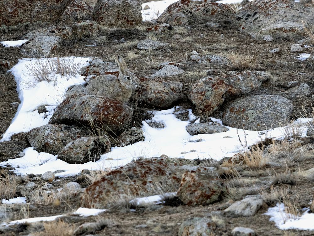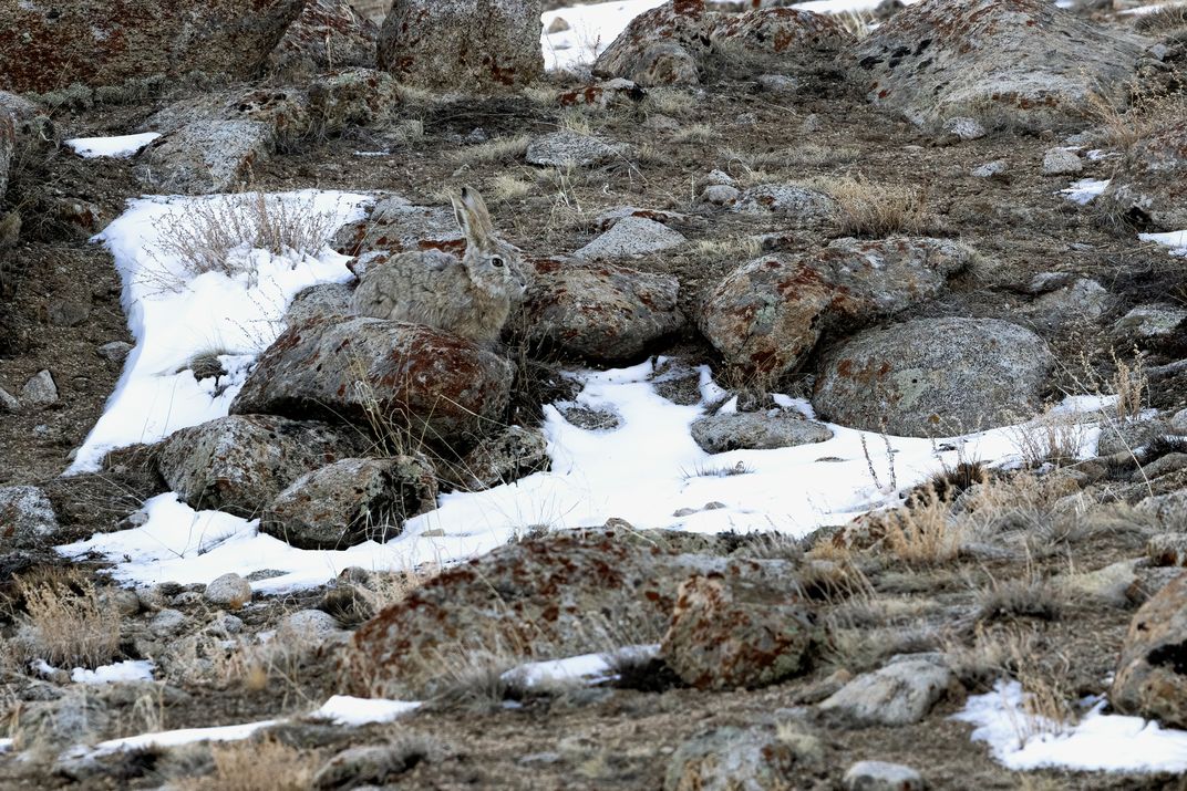A lone woolly hare is perfectly camouflaged, almost a ghost among the mottled rocks and patches of snow in this image. This particular hare was photographed in Warila, India, a testament to its specialized survival in one of the world's most extreme environments.