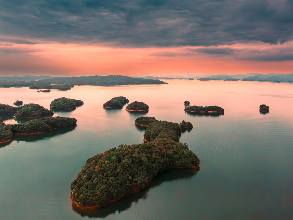 "When the lens focuses on Xihai(west sea), an exquisite landscape painting unfolds gently before the eyes. Lushan Xihai is a treasure bestowed by nature—a flowing poem between heaven and earth, a silent painting rendered by the universe. The lake’s surface, clear as a mirror, shimmers under the caress of sunlight, like thousands of scattered diamonds glistening on the water. Over 8,000 islands are dotted across the vast expanse like emeralds inlaid upon the azure canvas or jade pieces scattered under starlight. The Heart-shaped Island resembles a romantic verse written by nature itself; its naturally formed silhouette, adorned with lush trees and blooming flowers, whispers tales of love and tenderness. The ""Lone Tree in the Sea"" stands like a solitary sage between sky and water, weathering wind and rain, watching clouds gather and drift, silently witnessing the passage of time. Ascending the Xihai Star Glass Tower feels like stepping into the clouds. Beneath transparent glass floors and amidst drifting mist, the panoramic view of countless islands unfolds. And as the sun sets, a grand symphony of light and water begins. The sun, like a gentle painter, brushes soft hues across the lake, while distant mountains embrace the water in a tranquil ink-wash scene. Then, the horizon ignites with brilliant twilight, bursting like magnificent fireworks, setting the entire lake ablaze with ripples that shimmer like a fallen galaxy. At Xihai, every drop of water carries the rhythm of poetry, every island holds the blank space of a painting, and every glow of sunset is nature’s heartfelt confession—leaving one enchanted, reluctant to depart. "