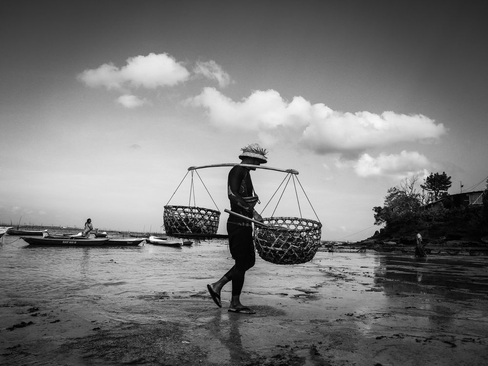 The Nusa Lembongan island in Bali, Indonesia is home to some interesting seaweed cultivation. The island people manage this on their own and almost every household on this tiny island has a share on the wide farm. This is Made who carries the ripe seaweed from the ocean in his twin baskets toward the processing place.