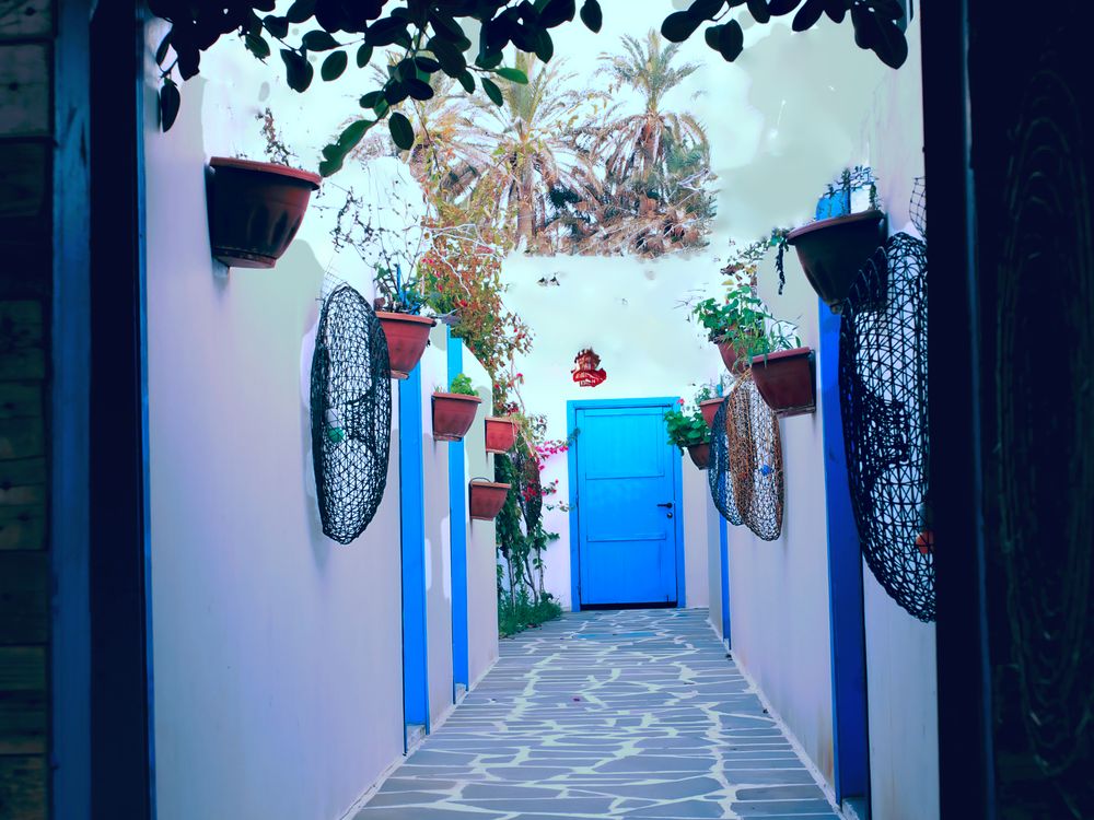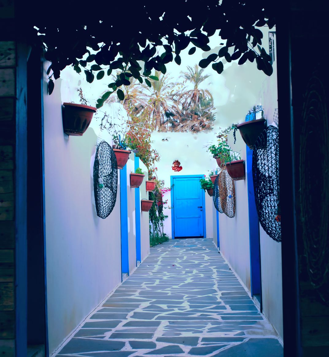 This photo is showing a Blue door. The path way shows the blue door hidden beyond the brick wall.