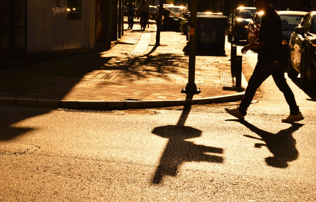 A figure crosses the street as late-afternoon light turns the asphalt into gold. Shadows stretch and blur, creating a moment where movement, heat and brightness merge into a single fleeting gesture of the city.