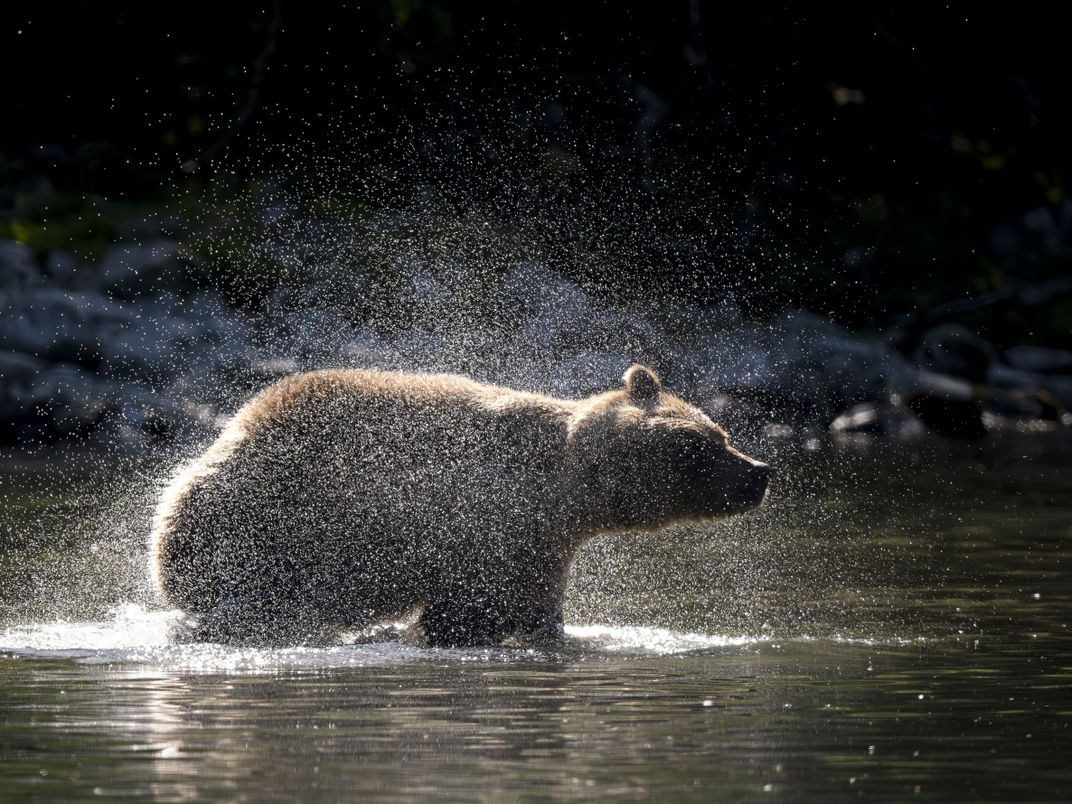 A coastal brown bear shakes off after fishing in the shallow waters of Lake Clark National Park, sending a cloud of droplets into the air. Backlit by the low sun, the spray briefly formed a glowing halo around the bear’s powerful frame.