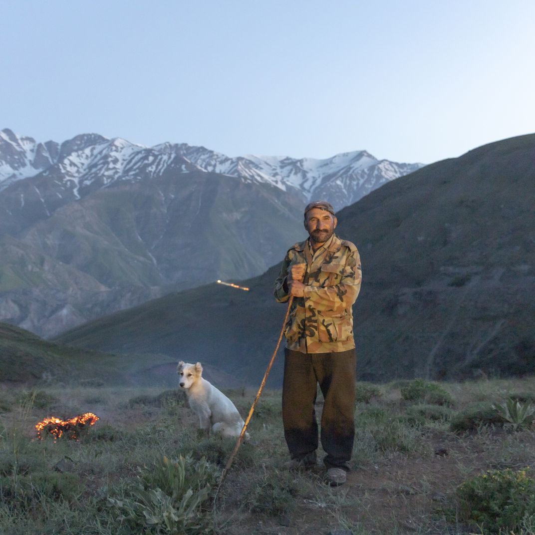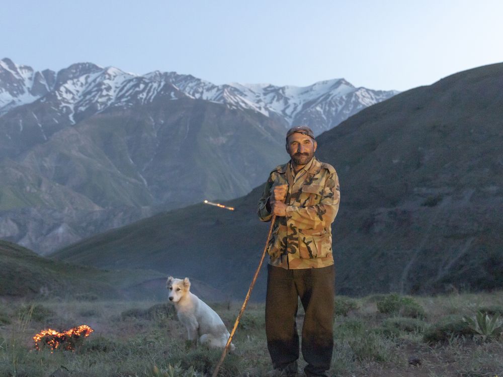 Shepherd with his dog by the fire in the mountains