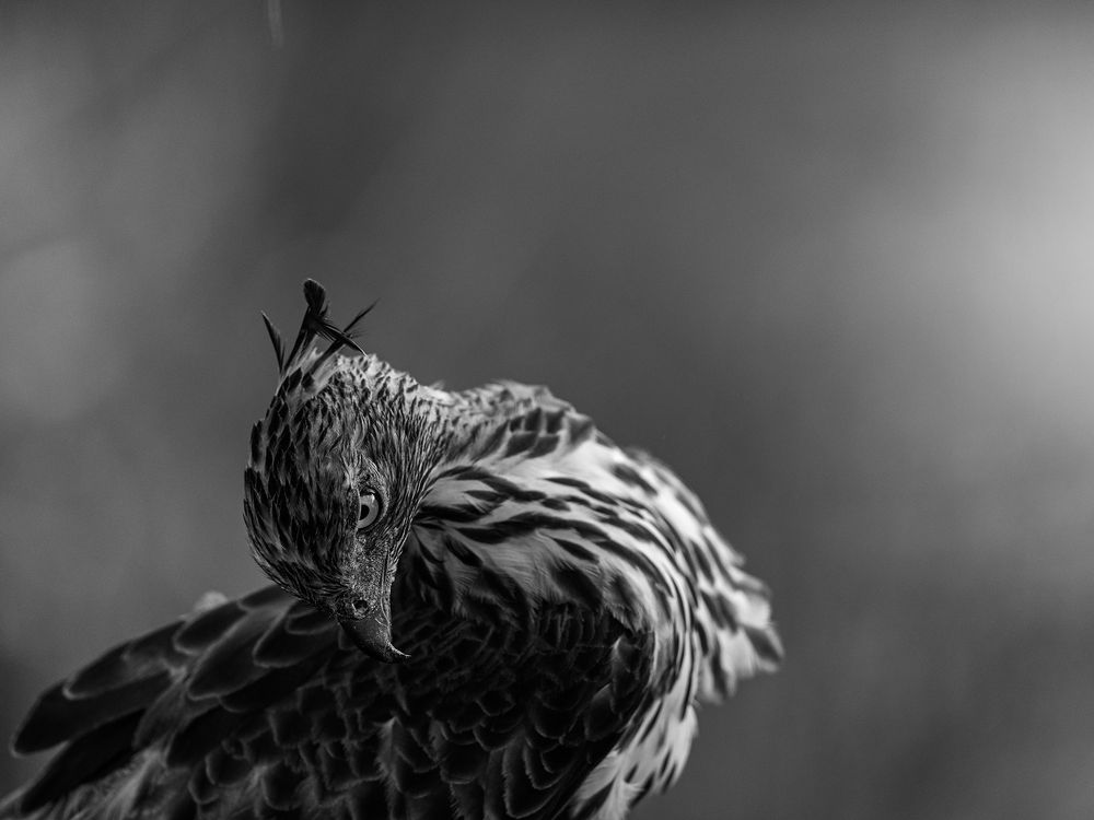 A crested hawk-eagle pauses at dusk in Yala, turning its piercing gaze toward my lens. The fading sunlight shaped a soft gradient around it, revealing both its power and vulnerability in a single quiet moment of the wild.