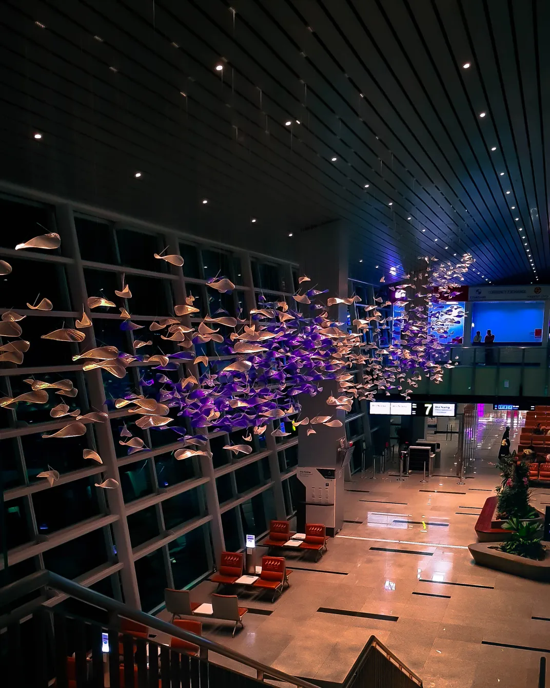 It captures the beautifully illuminated interior of Da Nang international airport. On the ceiling numerous wing-like sculptures are hung up to create an artistic version, where it looks like flock of birds migrating somewhere.