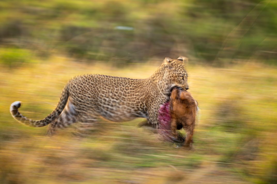 In the vast plains of Kenya’s Maasai Mara, a leopard moved with fluid grace through the tall grass, carrying a freshly caught Thomson’s gazelle in its jaws. The scene was both intimate and primal—a fleeting moment in the endless rhythm of predator and prey. Leopards are masters of stealth, and in the dense vegetation of the Mara, even a few steps can erase them from sight. I wanted to capture not just the animal’s power, but the sensation of motion—the quiet urgency of survival itself. Using a slow shutter speed of 1/10 second, I panned with the leopard’s movement, allowing the surrounding grass to dissolve into soft streaks of tone and texture.