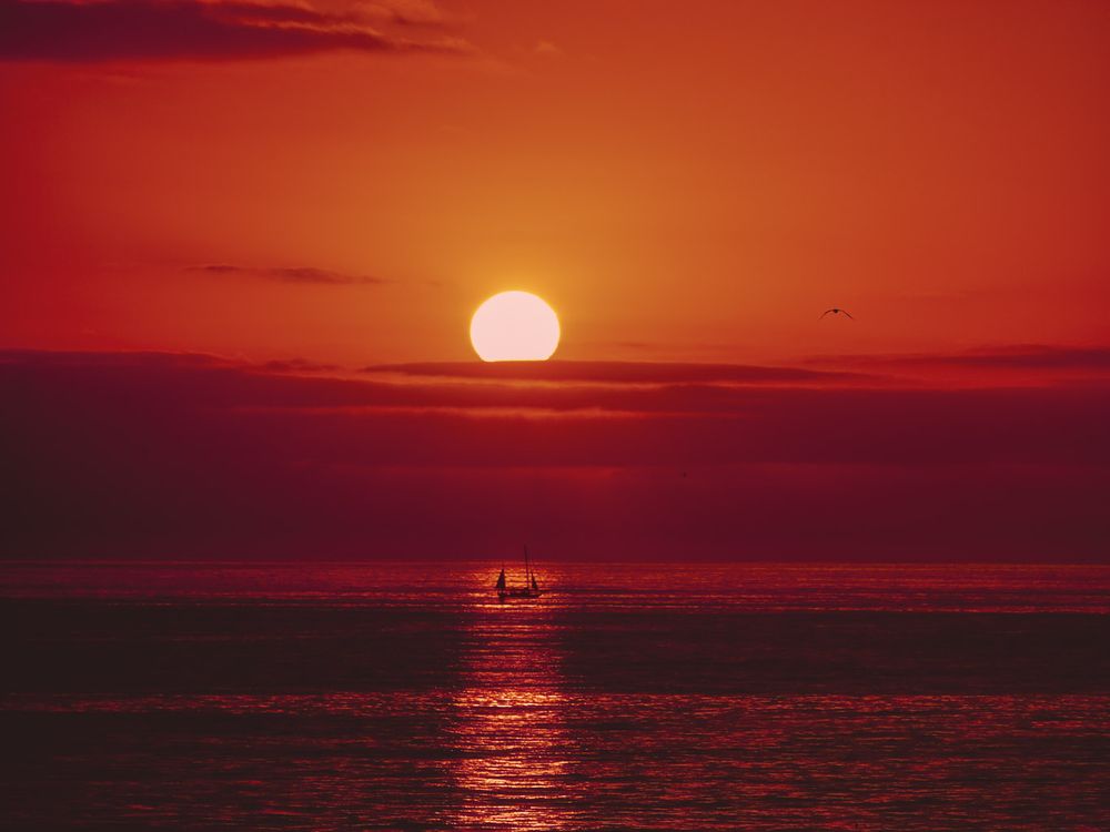 A sailboat passes through a stream of light as the sun sets.