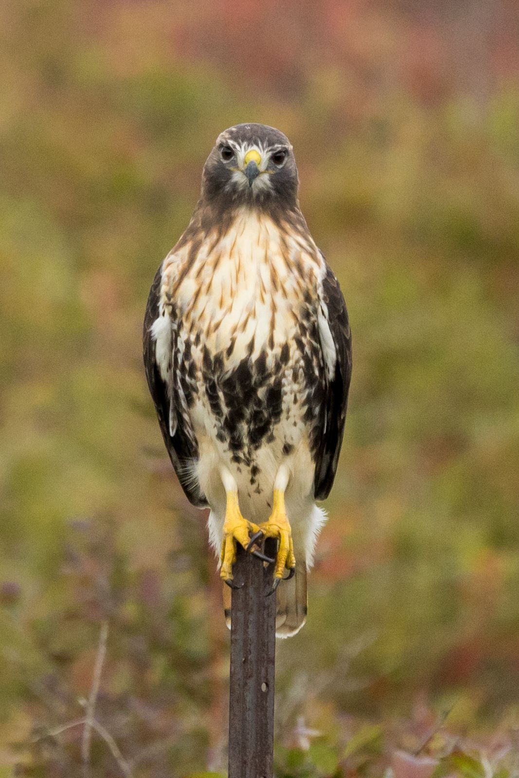 This lone red tailed hawk was perched on a post in a farmers field and I captured him face on which gives the impression he is smiling at me