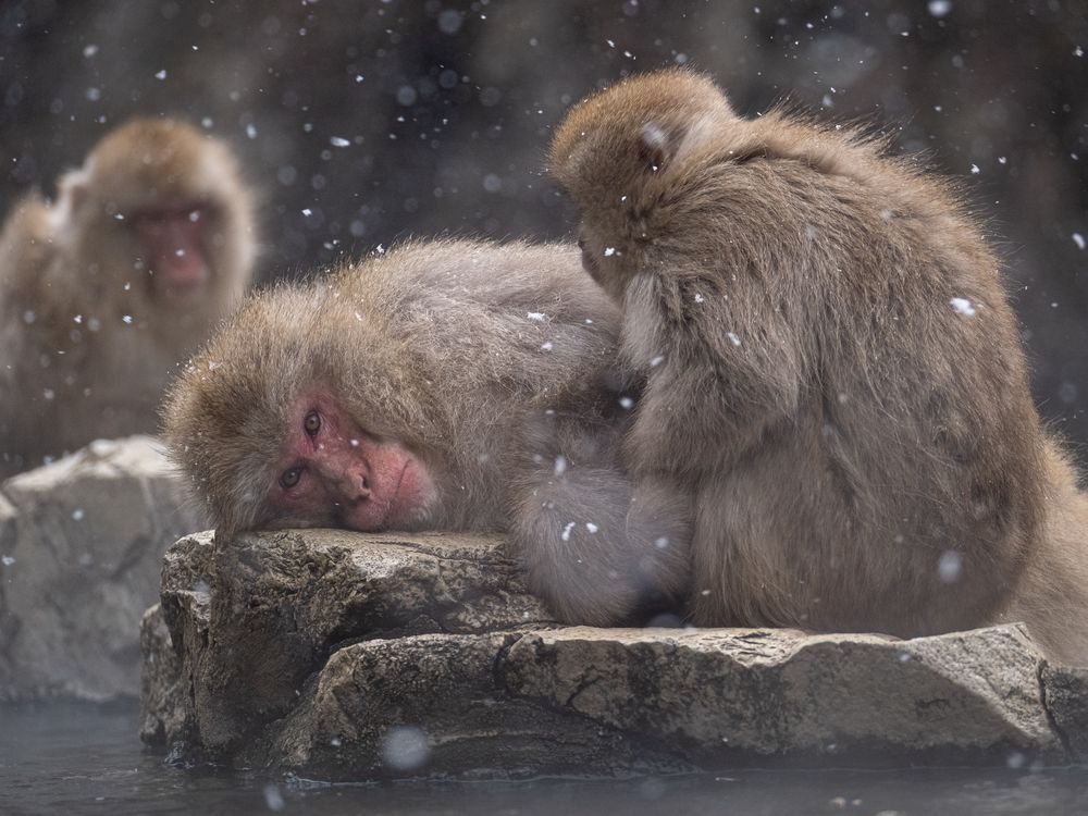 The snow macaques monkeys near Nagano, Japan, are world-famous for warming up in the hot natural baths. During the winter the monkeys spend many hours around and in the hot baths.