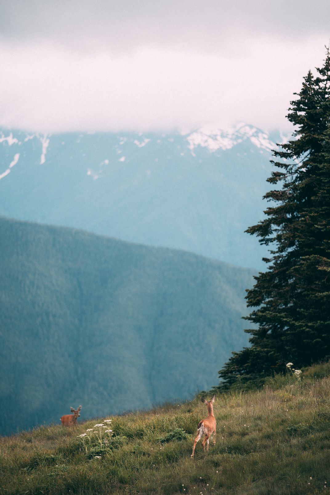 Two deer navigate the steep, grassy meadows of Hurricane Ridge against a wall of blue mountains. Captured on Independence Day 2025, this scene highlights the wild beauty and massive scale of Olympic National Park.