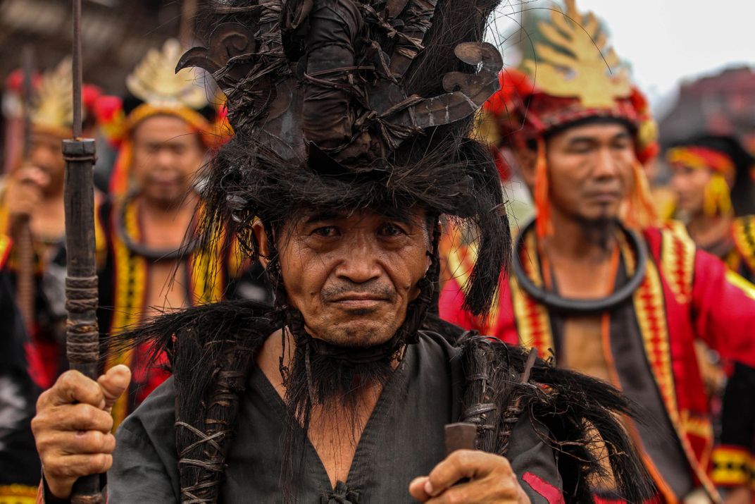A traditional war soldier wears war equipment made from natural materials, such as fibers and rattan. This soldier from Nias Regency is now an attraction for domestic and foreign tourists.