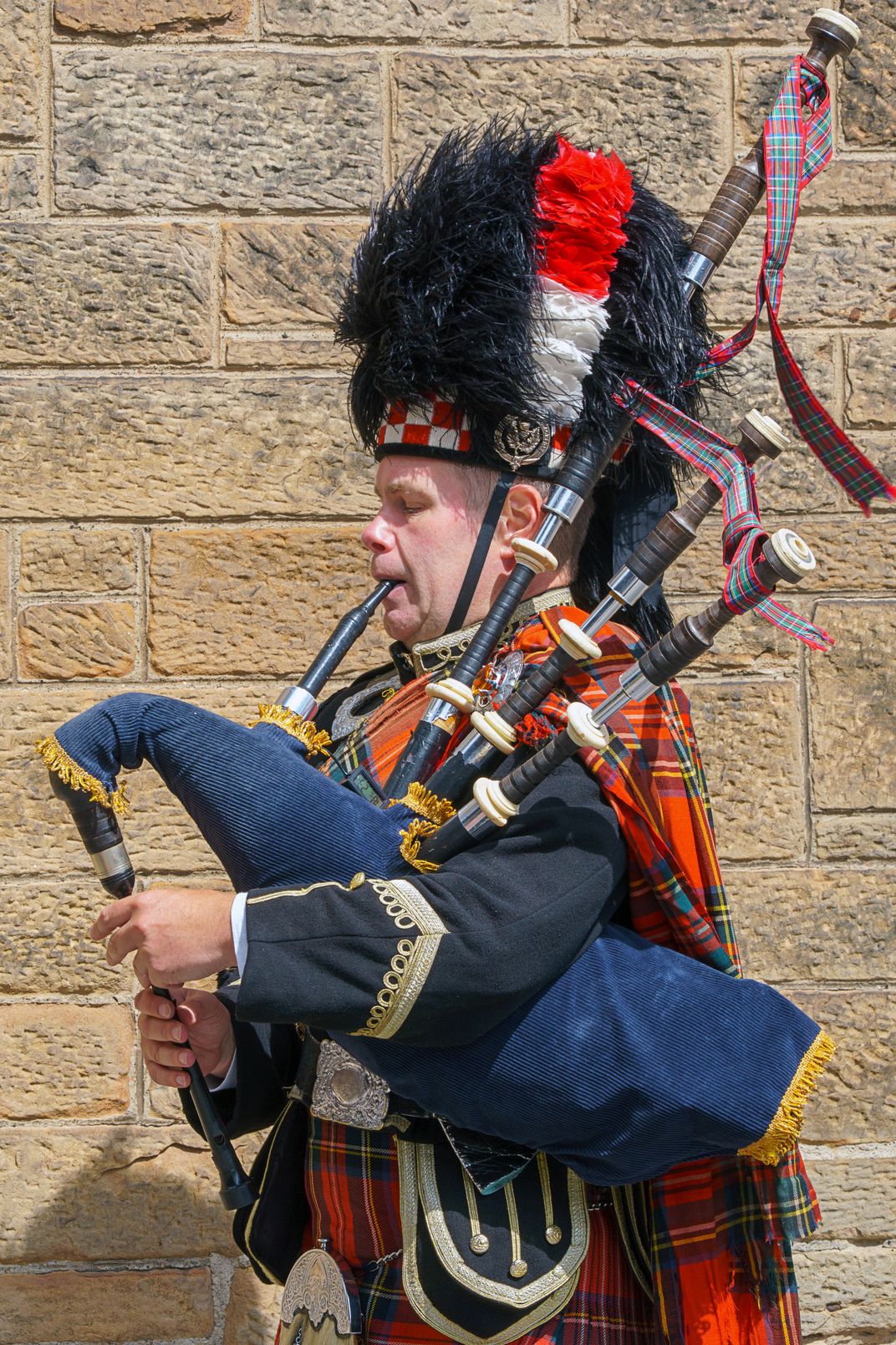 This photograph captures a lone bagpiper performing on the historic streets of Edinburgh — a timeless image where music, heritage, and place intertwine. Dressed in full Highland regalia, the piper stands against the backdrop of ancient stone walls, their deep tones echoing through the narrow closes and open squares of the old city. The moment feels suspended between past and present — a living tradition resonating through mist and memory.