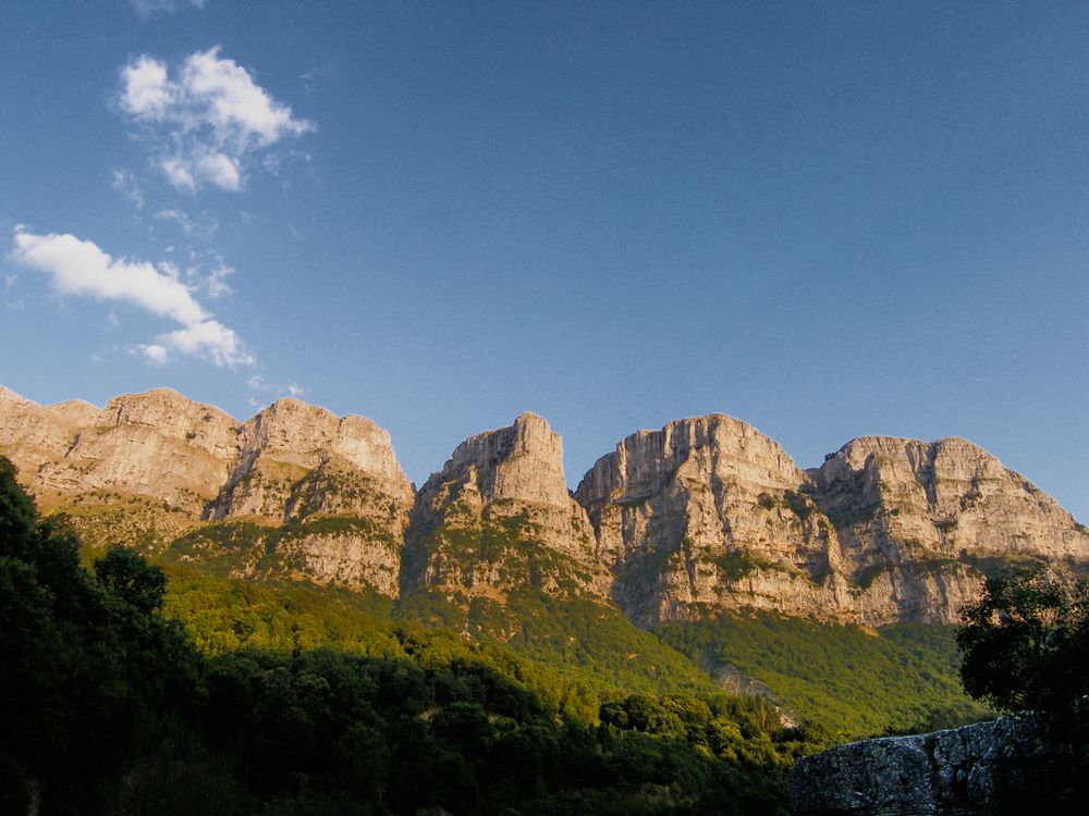 Evening light sweeps across the cliffs of Mount Tymfi in Zagori, revealing the sharp limestone towers that rise above the forest. A calm sky frames the rugged geometry of one of Greece’s most iconic mountain landscapes.