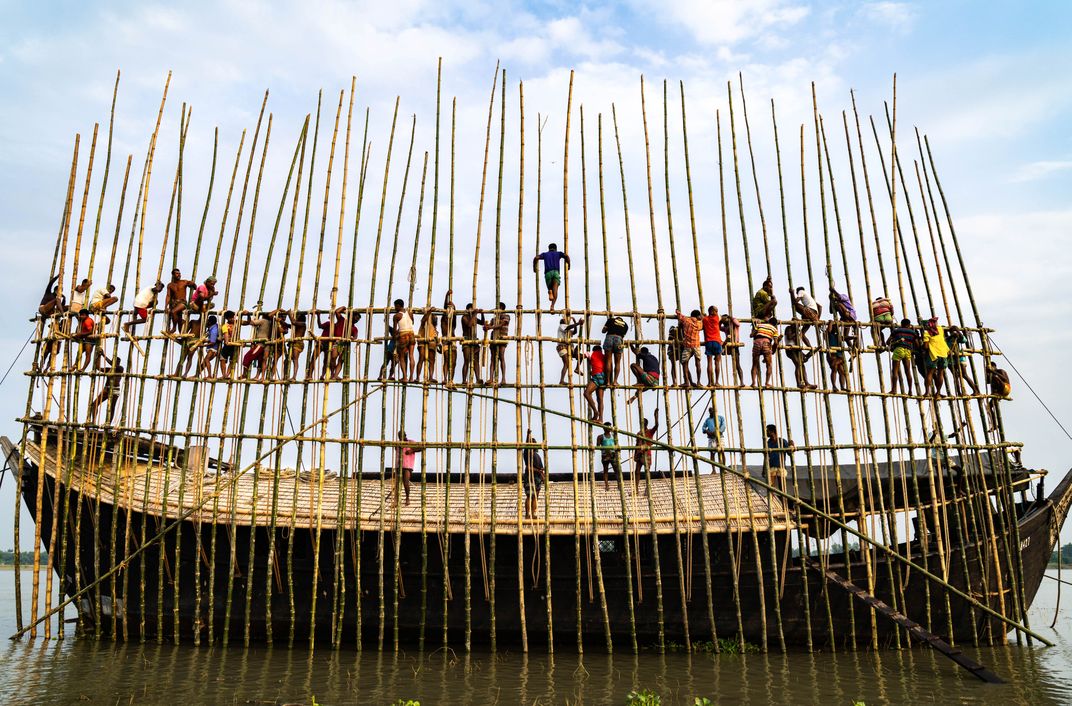 This is the last surviving Malar boat of Bengal, a traditional wooden vessel whose design dates back over 3,000 years. Today, rapid urbanization has pushed this cultural heritage to the brink of extinction. Measuring 93 feet (28 meters), the boat rests beneath bamboo scaffolding—the only method available in Bangladesh for turning and repairing such massive wooden hulls. Ropes are threaded through holes and lifted onto pulleys, while more than 100 people work together to overhaul the vessel. The process requires countless intricate steps, a labor of devotion that is increasingly rare. Once a vital part of Bengal’s identity, the Malar boat now stands as a fragile reminder of a disappearing tradition.