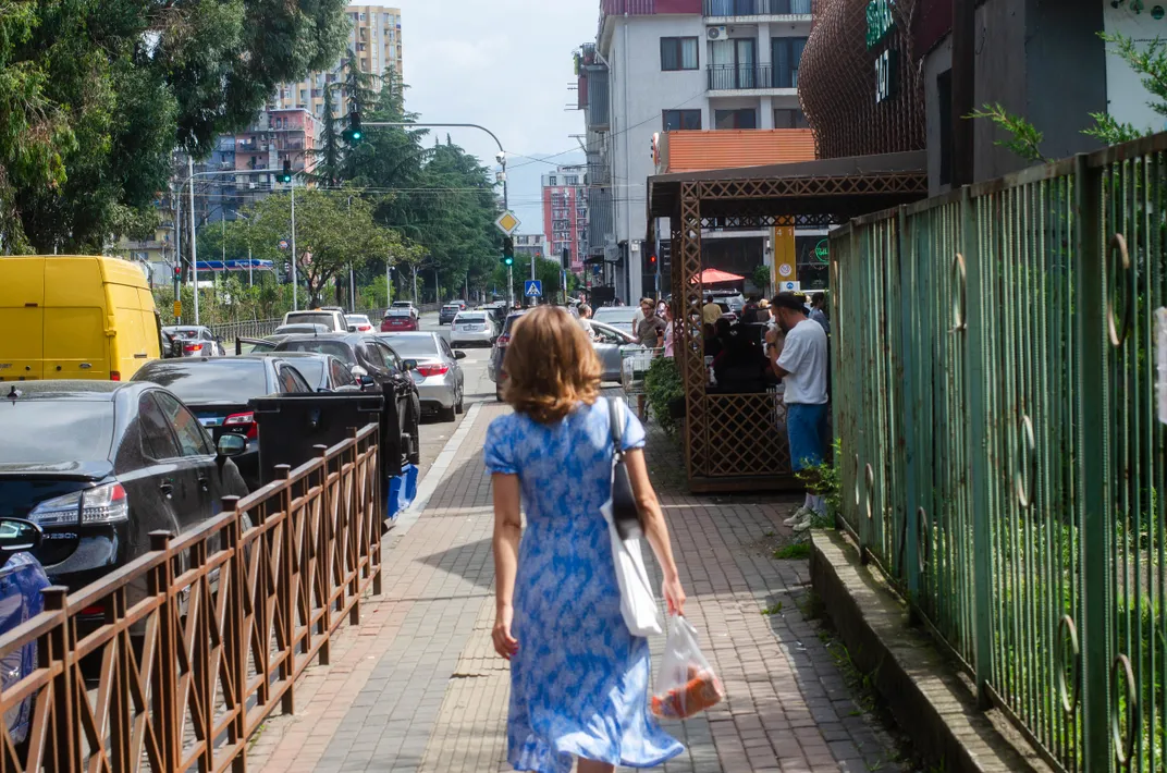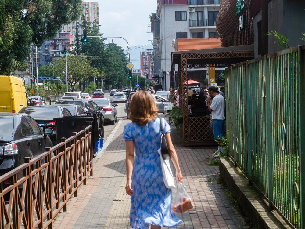 This image is a study of contrast and anonymity on a busy street in Batumi, Georgia. The subject, a woman in a vivid blue dress, walks away from the camera, carrying groceries. Her bright attire and forward movement are juxtaposed against the traffic, dark cars, and the harsh metal fence lining the pavement. The title reflects the essence of street photography—a fleeting moment captured, the beginning of a potential story that remains unfinished and unknown to the viewer. The frame captures the rhythm and mystery of everyday life in the city.