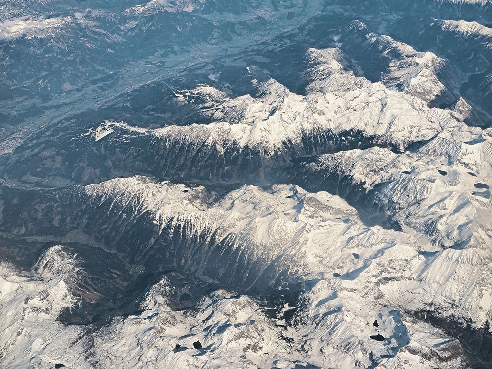An aerial photo of the Alps during winter taken on a plane ride between Bulgaria and the UK. I have always been fascinated by high views, and if I have the opportunity, I sit by the window when flying in order to admire nature's beauty from above.