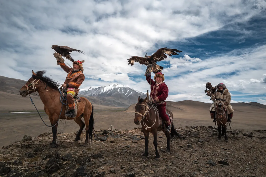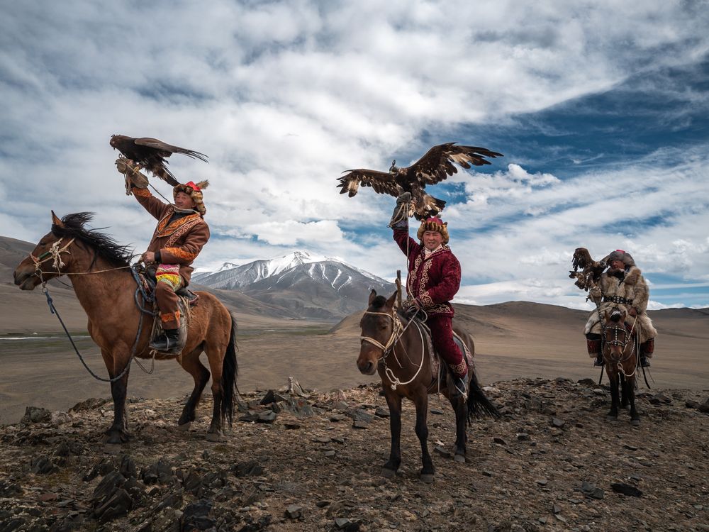 Three eagle hunters raise their birds high against the mountain wind. Dressed in ornate garments, they stand as living guardians of a tradition that defies time.