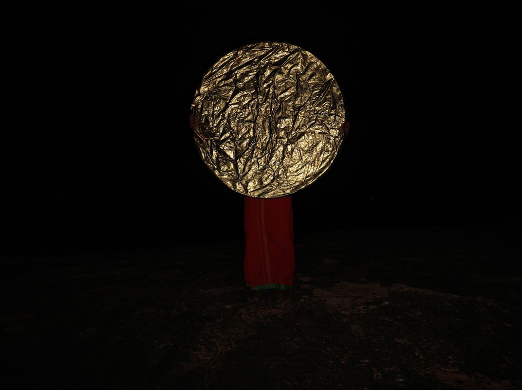 In the stillness of night,a figure holds a golden reflector that gleams like a handmade sun.The gesture blurs the boundary between the human and the cosmic a quiet act of bringing one's own light into the surrounding darkness,where creation and reflection become one..