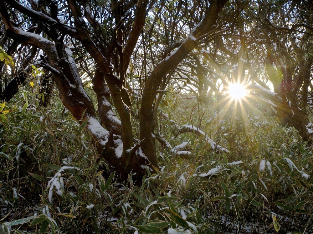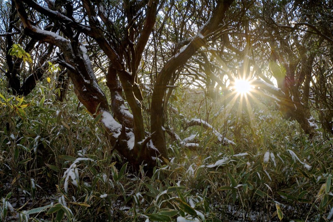 The sun is unable to completely melt the snow at the top of Mount Komagatake before it sets on November 12th, 2013.
