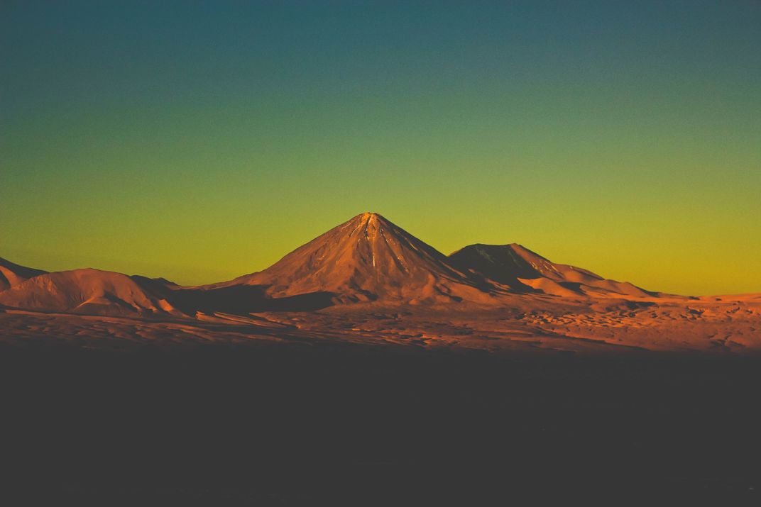 The glorious sun sets over the backdrop of a mountain in the Atacama Desert, the driest desert in the world.