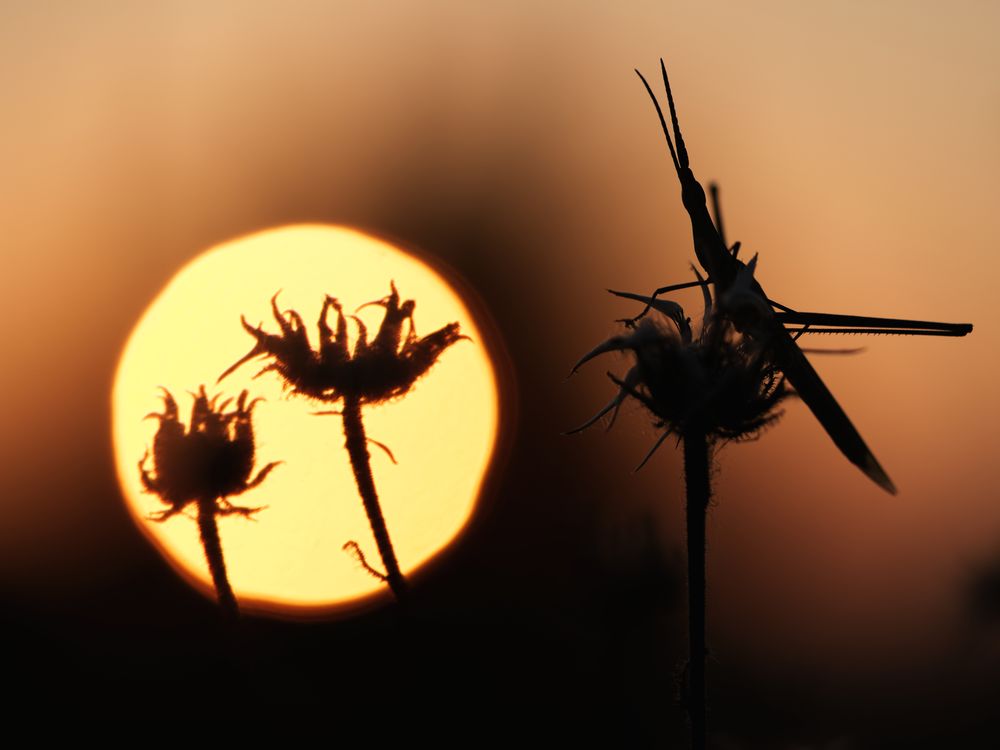 A backlit silhouette photo of an Acrida ungarica. I placed my camera in a way so that I framed some nearby plants in the sun so that I would create an image which can spark the viewers' imagination