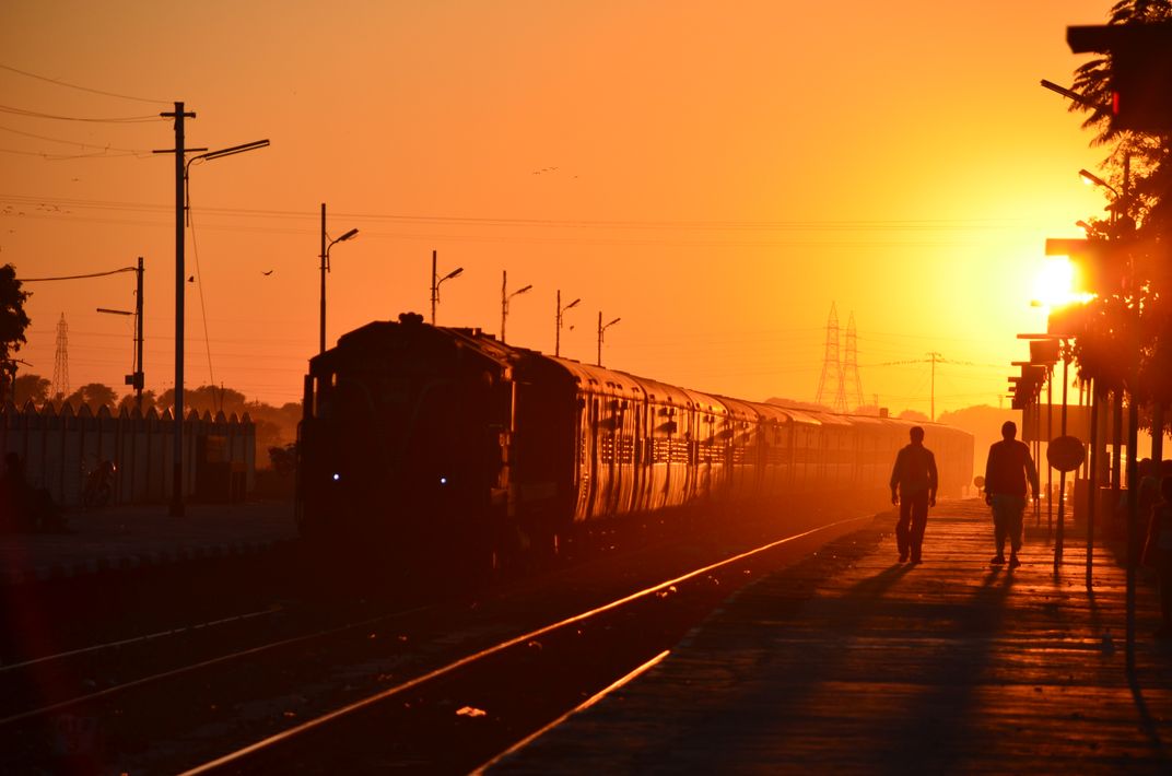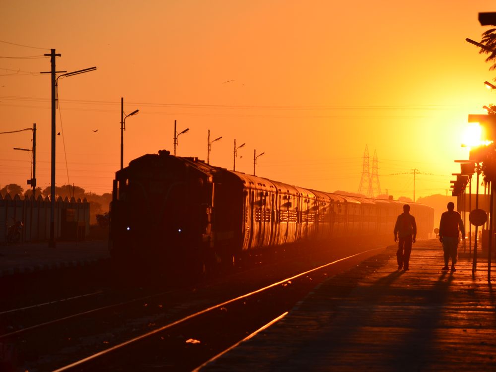A train arrives slowly at a small town railway station in Madhya Pradesh, India.