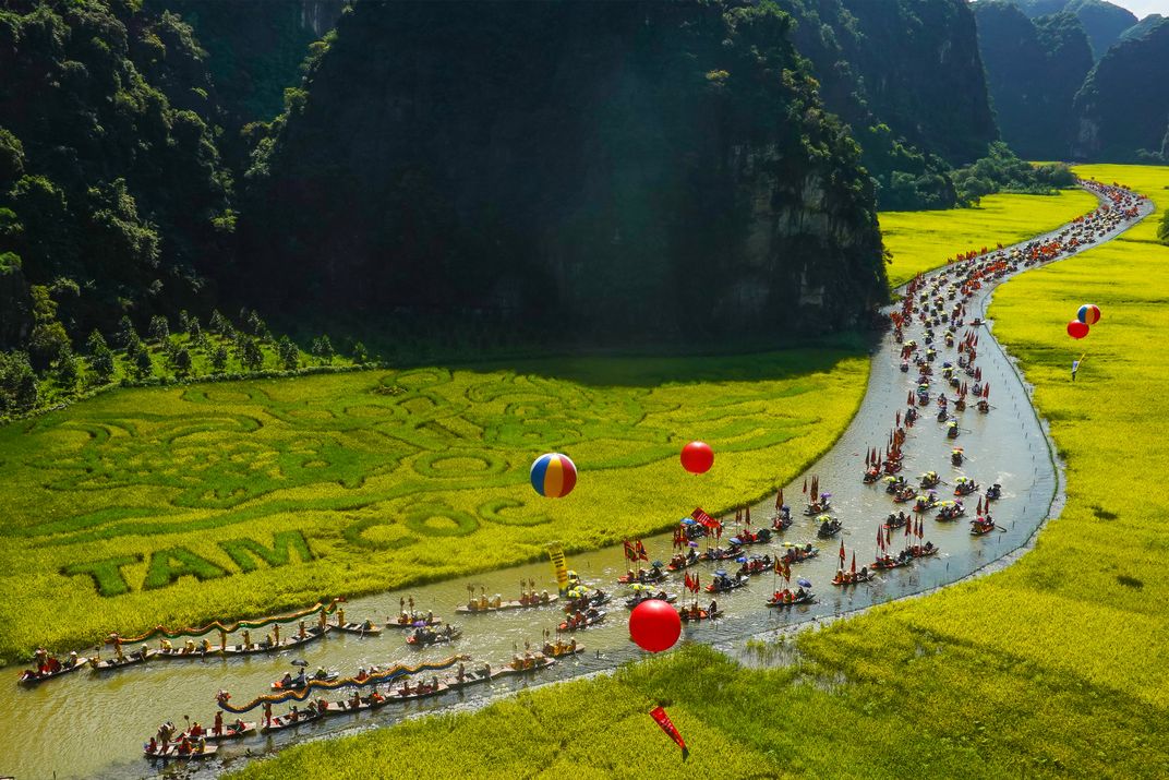The highlight of the Tam Coc-Trang An Golden Rice Festival is the procession on the river with the participation of 63 boats carrying typical products from regions across the country as offerings to the God of Agriculture, while also honoring the beauty of farming of farmers in the Northern Delta in general and Ninh Binh people in particular. Tam Coc-Bich Dong Tourist Area held the Tam Coc-Trang An Golden Festival the opening event of the annual Ninh Binh Tourism Week