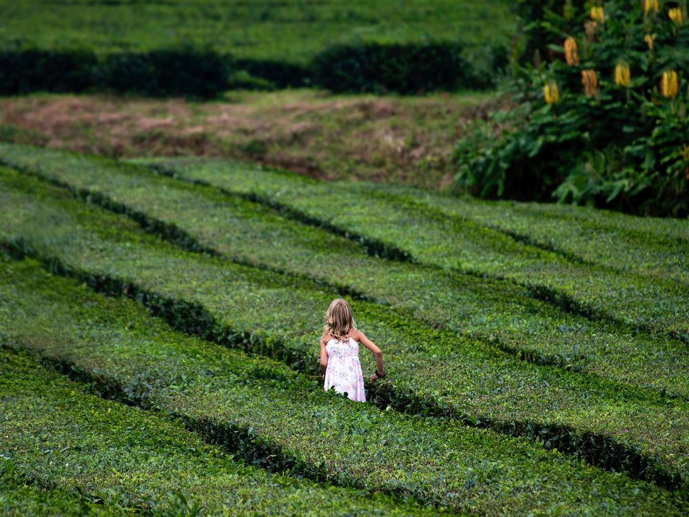 A young girl runs through the tea fields of Gorreana, Europe’s oldest tea plantation on São Miguel Island, Azores — a quiet moment of innocence amid waves of green history.