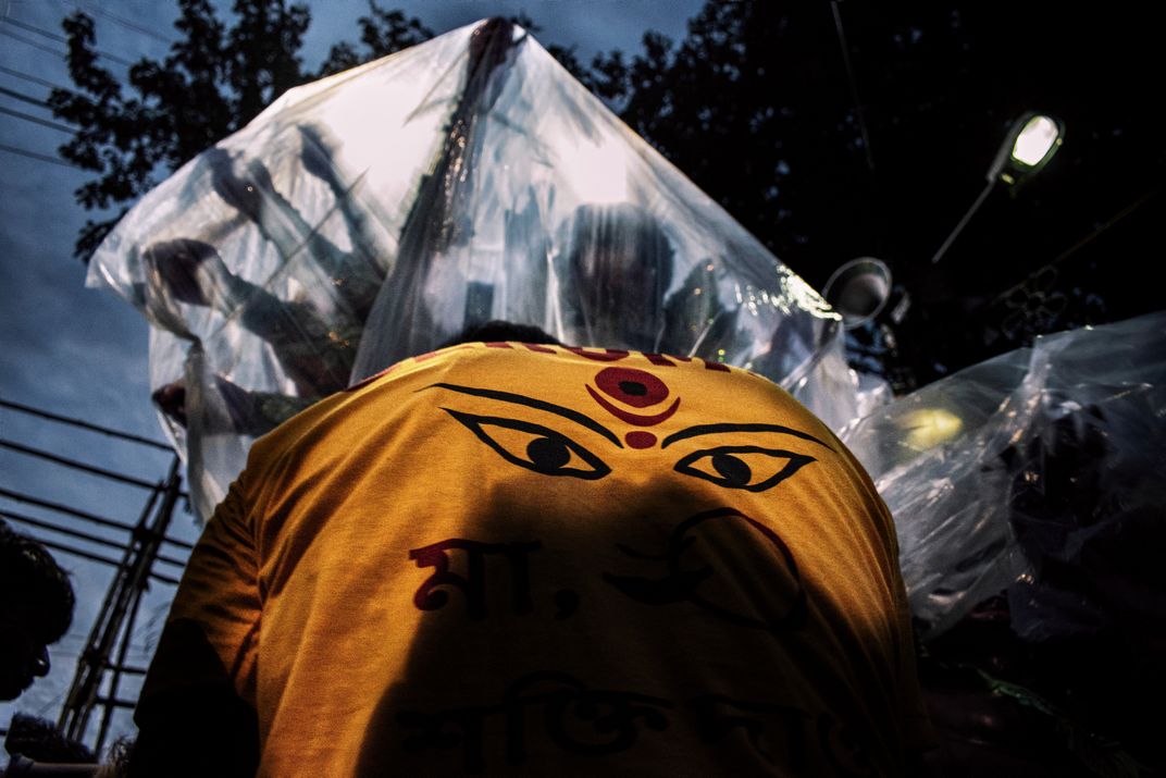 The frame was created in the event called “Emersion of Durga”, a typically soulful festival of India. The posture of Maa Durga is in silhouette mode whereas the backside of the t-shirt represents her face.