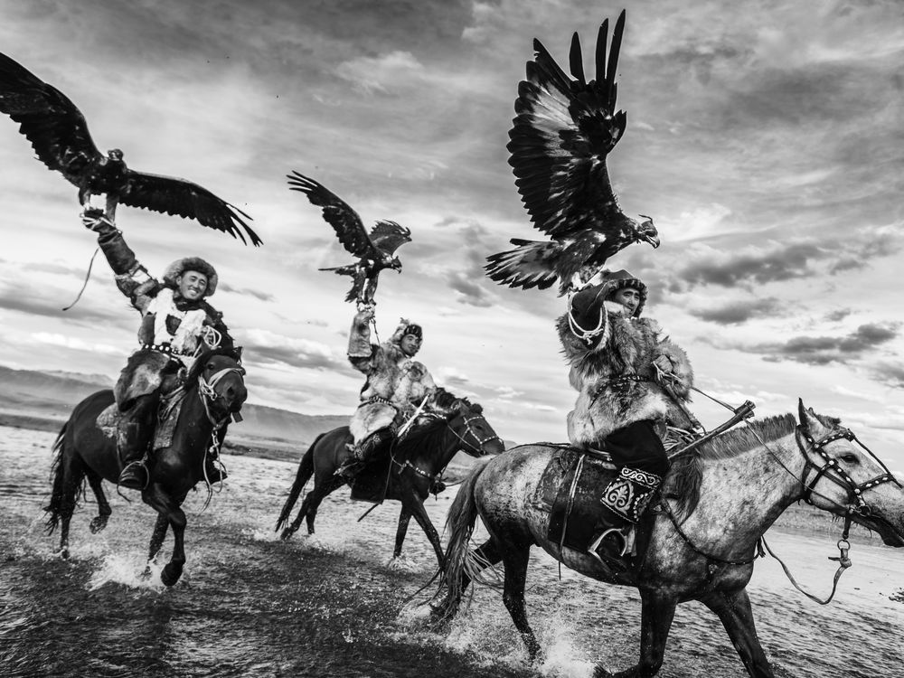 Kazakh eagle hunter Arman and his friends are riding across the Sagsai river in Western Mongolia. They are each mounted on a sturdy horse with their traditional attire reflecting the rich cultural heritage of the region. With their majestic eagles perched on their arms which is symbolizing the deep bond between humans and nature in this remote part of the world.