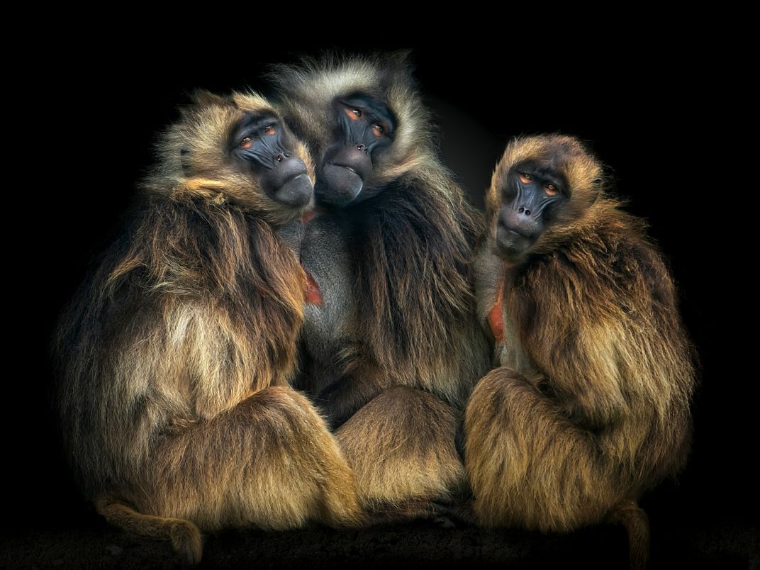Three geladas huddle closely in a moment of tenderness, their bodies intertwined and eyes glowing softly. Against a black background, their unity and quiet empathy take center stage, evoking themes of family, connection, and shared warmth. The composition distills a universal need for affection and belonging, inviting viewers to reflect on both animal and human bonds.