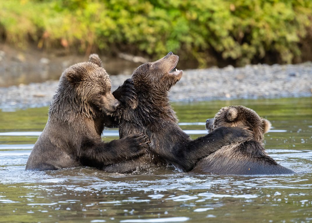Three Kodiak brown bears wrestle in the river. Two of the bears are siblings and the third in the middle is another juvenile that seems to enjoy hanging out with them. Kodiak brown bears are their own subspecies of bear and due to their ideal environment they are the second largest bear in the world, behind polar bears. They can weigh up to 1500 lbs and stand up to 10ft tall on their hind legs.