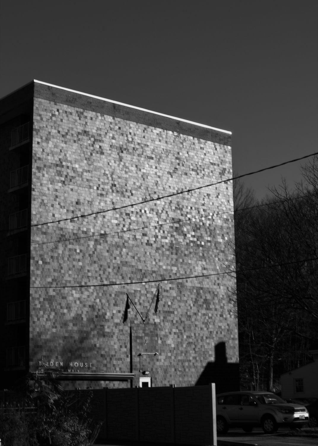 The Tilden House is a public housing project in the city of Barre, Vermont. The reflection of the light is from the brick of the side.