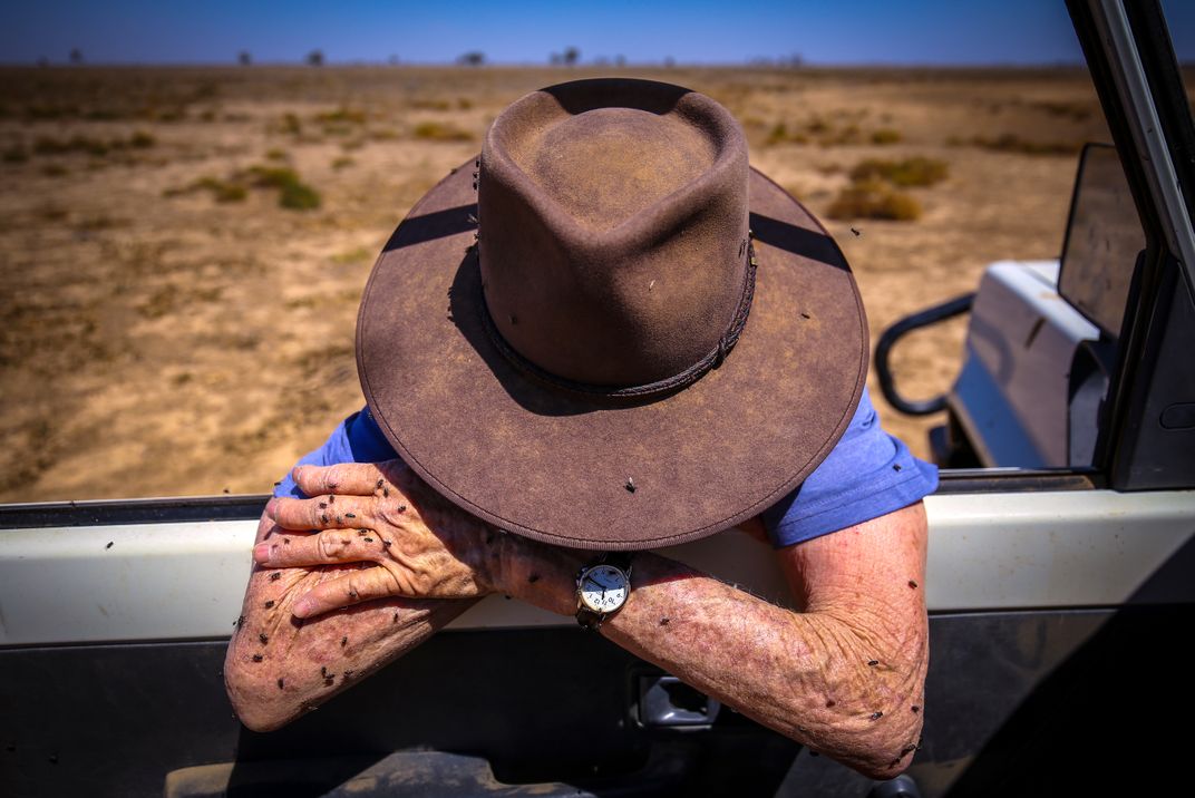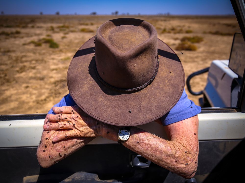 May McKeown, covered in flies, rests on the door of her truck as she inspects her drought-affected property of ‘Long View’ on October 5, 2019, located near the town of Come By Chance, in north-western NSW, Australia. 80-year-old May McKeown has lived alone on her 6000 acre (2400 hectare) property of 'Long View', located around 700 kilometres north-west of Sydney, for most of the last 15 years. McKeown’s family has been farming in the northwest corner of New South Wales state since the late 19th century. Her son Johnnie recently returned to the farm after working for many years abroad, bringing in a valuable income to keep the farm running. May inspects the property daily, carrying bales of hay to hand-feed her cattle. She says she constantly wonders when this current devastating drought affecting the flat north-west plains will end, adding that this year they have only received less than 400mm, and the last 'decent' rain the property received was nearly a decade ago - in 2010.