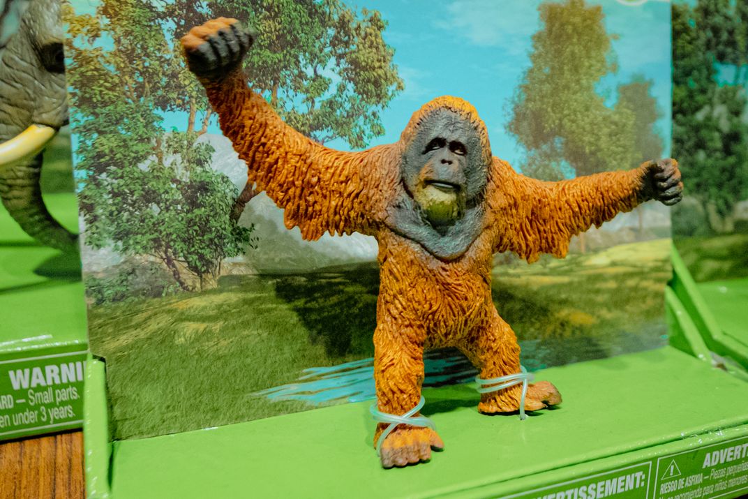 A toy of orangutan seen on shelves at the merchandise shop of Singapore Zoo. It is a static plastic representation of a magnificent creature, that’s trying to imitate the essence and vibrancy of a great ape. This plastic figure is a stark reminder of the commodification of nature in the modern world.