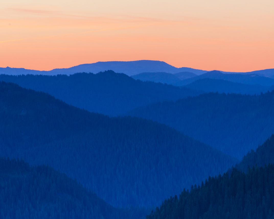 Just before the sun rise, the sky turned orange casting a blue shadow over the layered ridges of mountains
