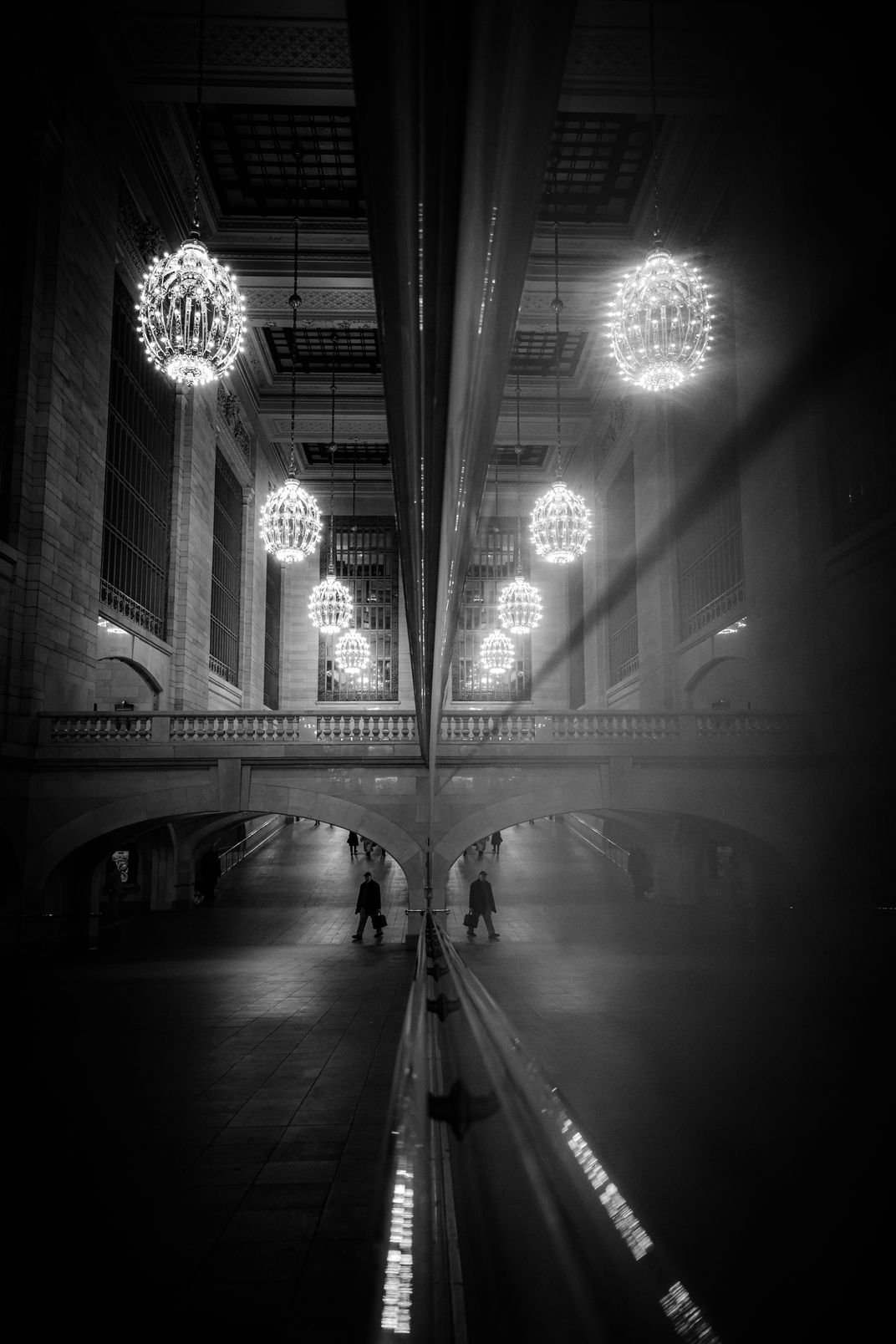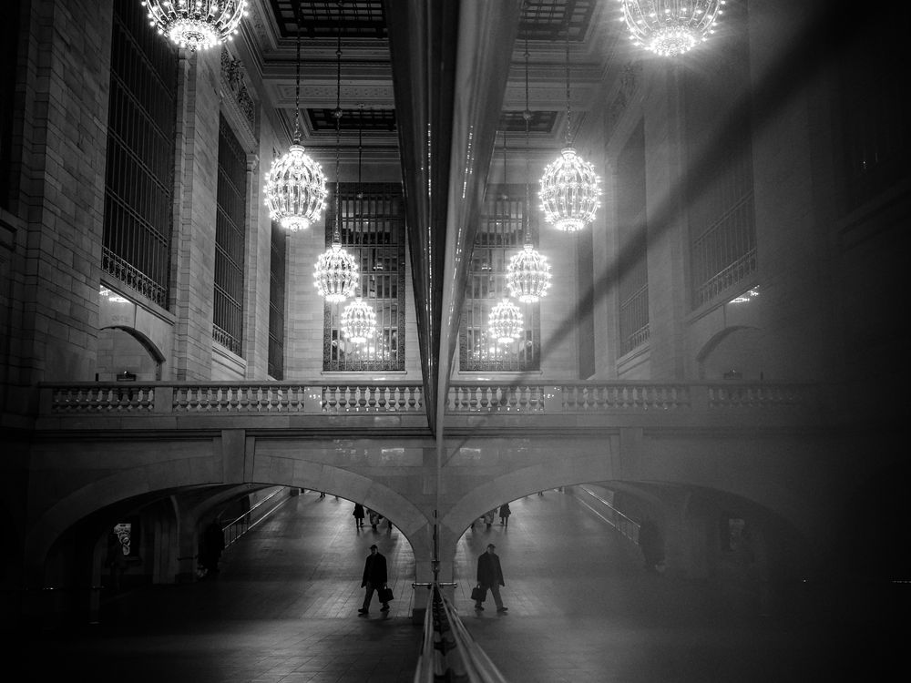 A traveler walking through the halls of Grand Central station as his reflection is captured in the marble walls.
