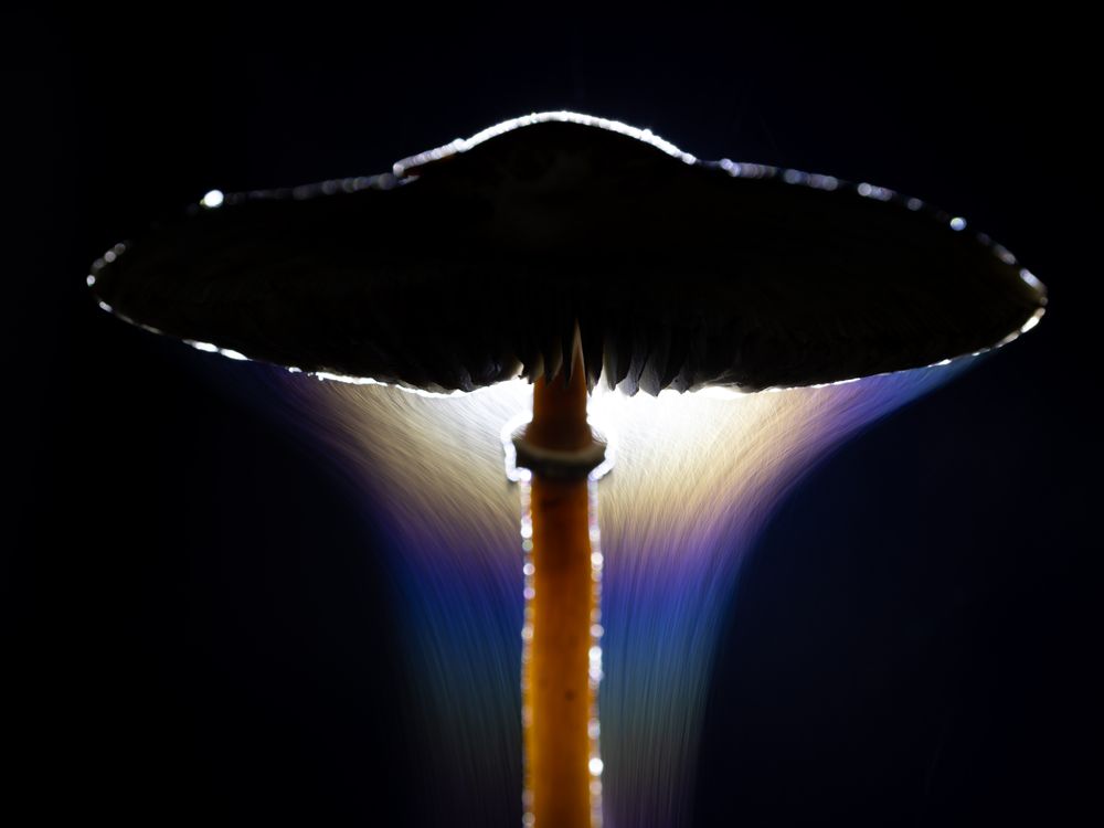 This photograph captures a breathtaking moment of botanical magic: a Parasol Fungi species actively releasing its spores, transformed into a vibrant light show through a unique photographic technique. The scene is set against a natural backdrop, with the fungi emerging from the side of a broken log of wood, providing an organic stage for this delicate phenomenon. The critical element of this image is the use of a white LED light source strategically placed behind the mushroom. This deliberate backlighting, combined with the perfect stillness of the air—achieved by waiting for a moment with absolutely no wind—allowed for an immaculate display of light diffraction. As the microscopic spores drifted downwards, the light caught and fragmented through them, creating a spectacular "rain" of light. Utilizing a long exposure, the individual spores cease to be discrete particles and instead coalesce into ethereal, colorful bands or streaks of light. These luminous trails paint the air beneath the fungi with hues born from the microscopic interaction of light and matter, turning the often-unseen process of sporulation into a vibrant, abstract spectacle. The image is a testament to patience, precise lighting, and the hidden beauty of the natural world.