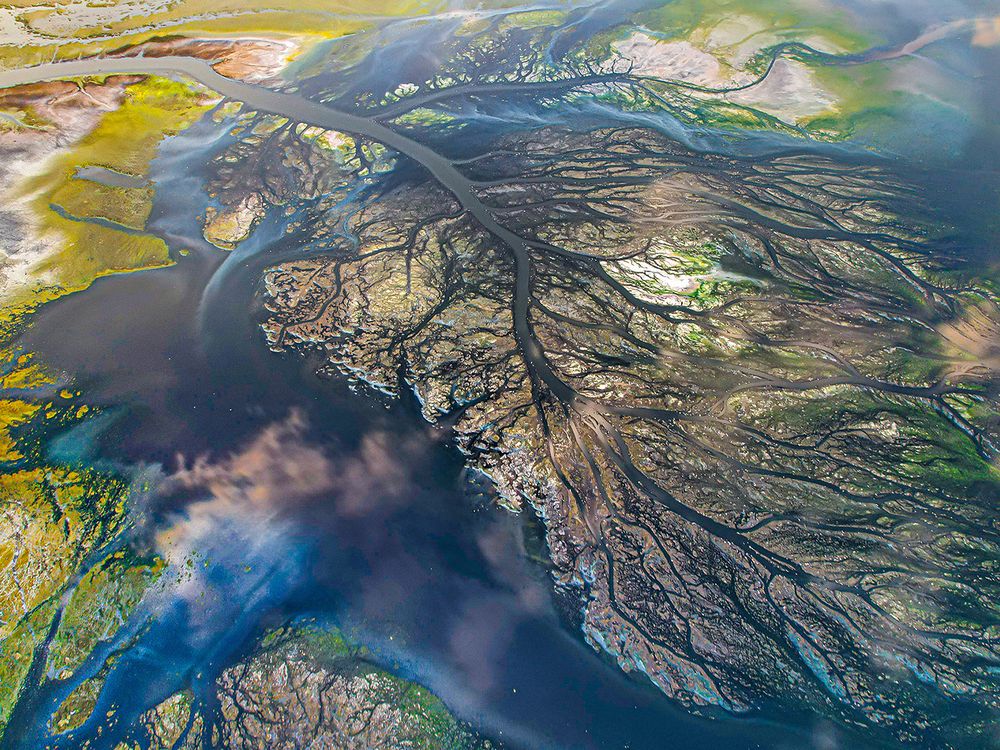 An aerial view of a vast river delta where branching channels resemble organic veins across the landscape. The mix of sediments, algae and tidal water creates a natural painting that reveals the complexity and beauty of Earth’s ecosystems.