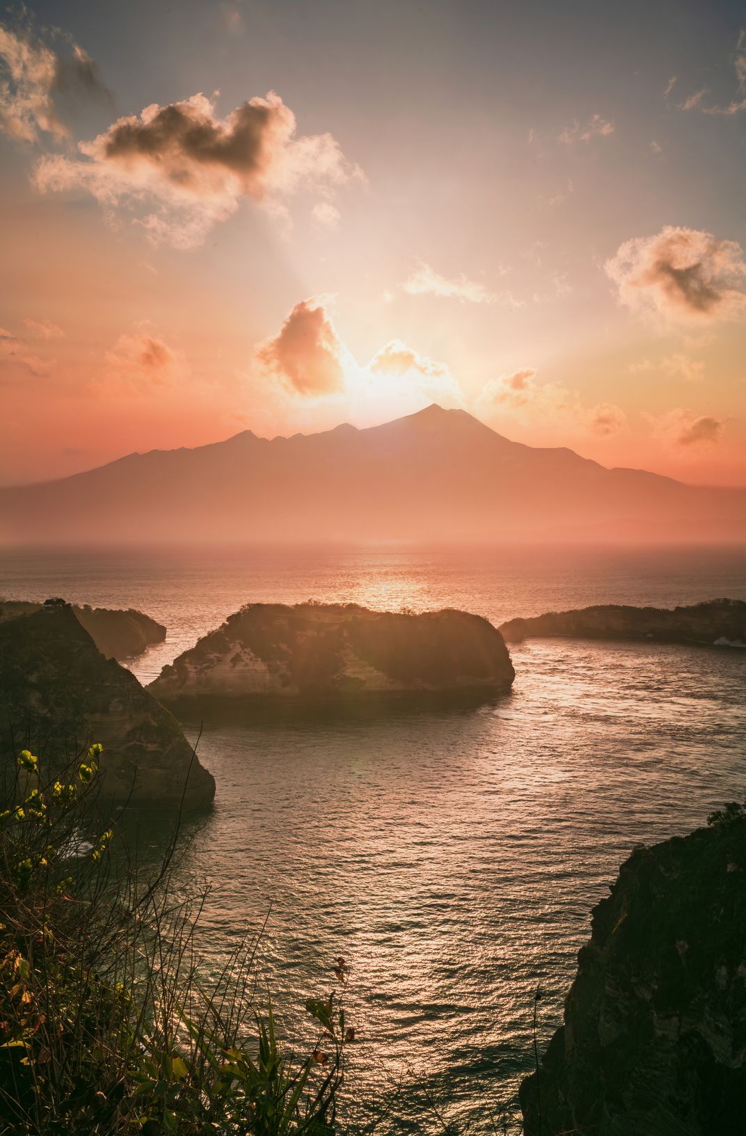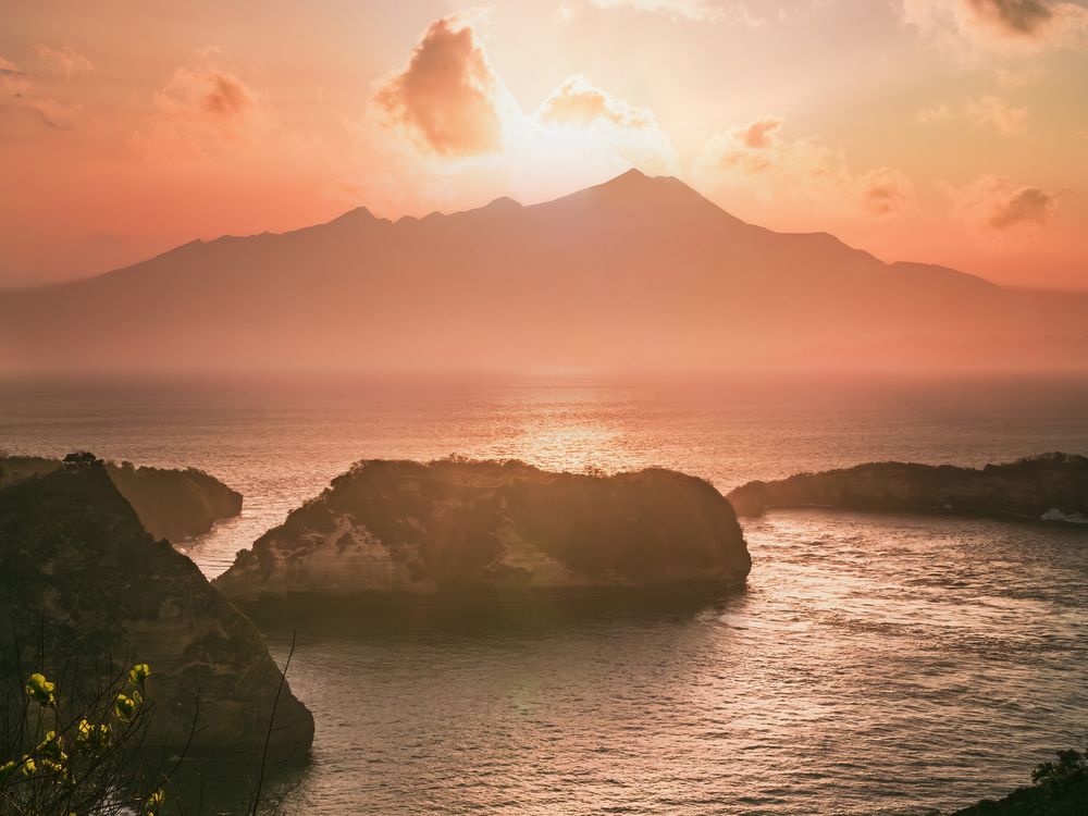 From the tree house in Penida,Indonesia, we can clearly see Mount Rinjani on the opposite side of Lombok Island. The moment of sunrise is very spectacular.