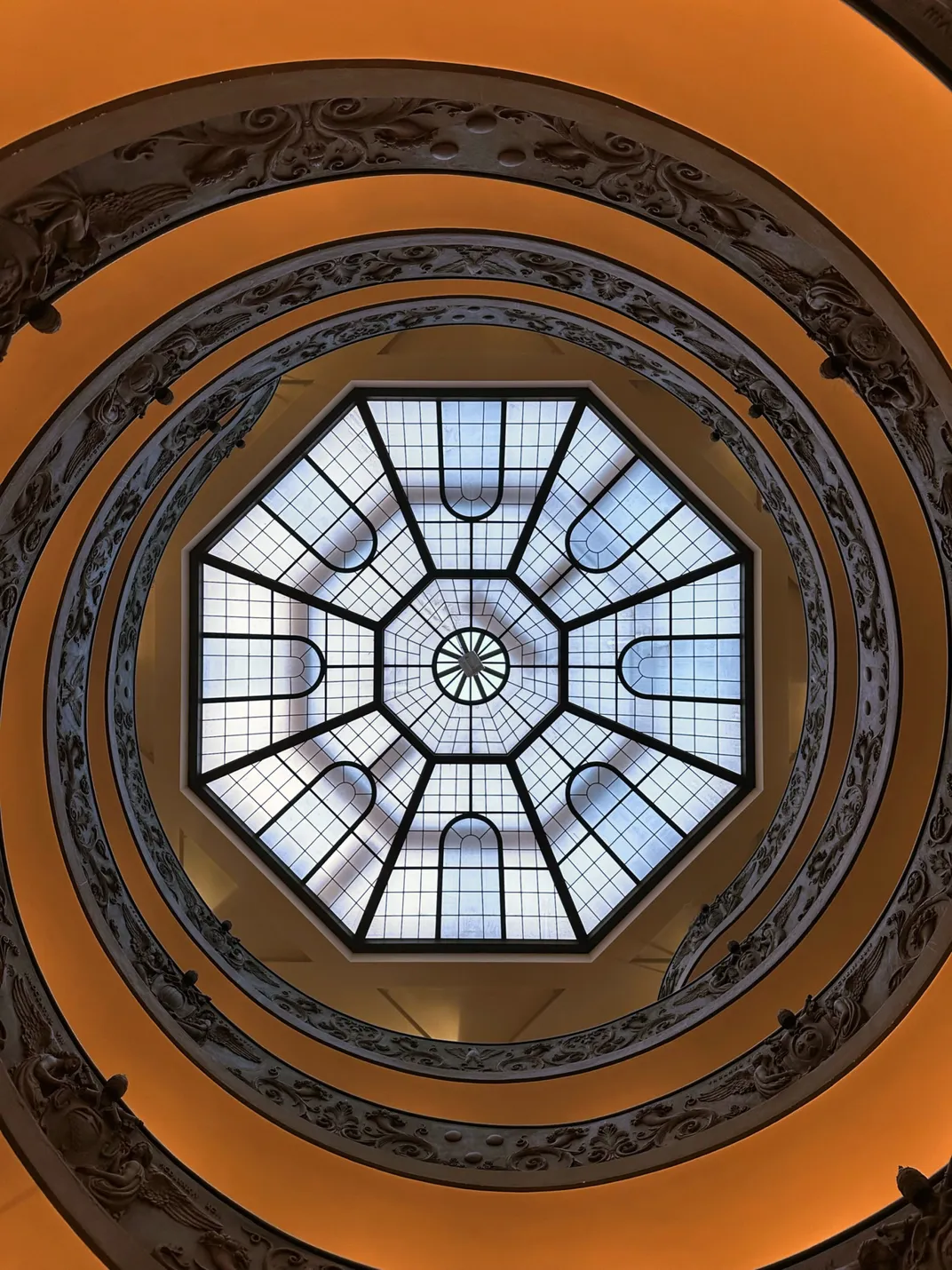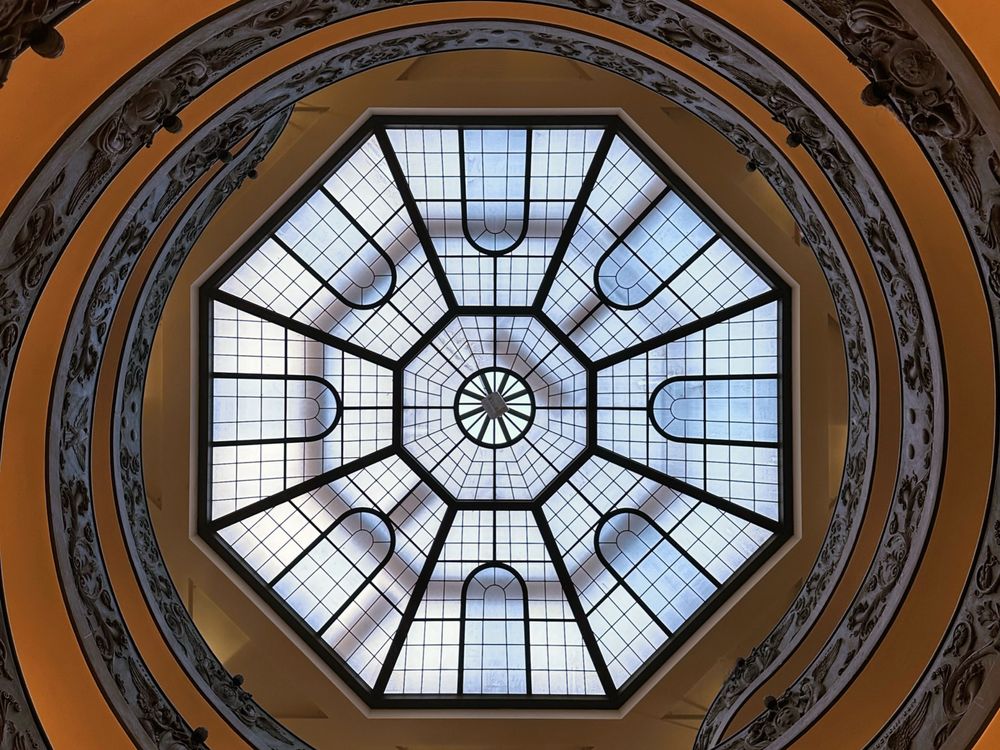 Looking up through the magnificent Bramante Staircase in the Vatican Museums (Museo Pio-Clementino). The spiralling architecture draws the eye towards the central skylight, which floods the historic structure with natural light, creating a sense of awe.