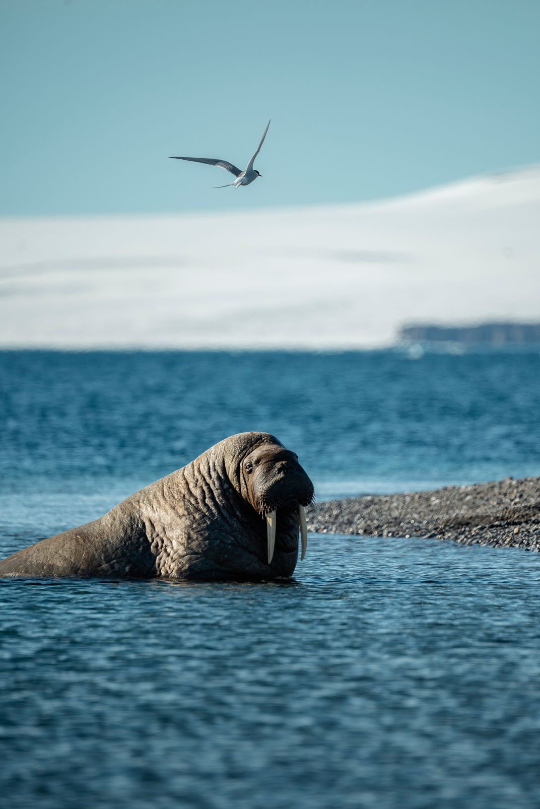 A walrus and an Arctic tern on the shore of Andréeneset, Svalbard. Andréeneset is headland at the southwestern point of Kvitøya Island in the Svalbard archipelago. It is named after Arctic explorer Salomon August Andrée. It is renowned for being home to one of the largest walrus colonies in Svalbard. A wide variety of birds can also be seen there, such as long-tailed ducks, white gulls and Arctic terns.