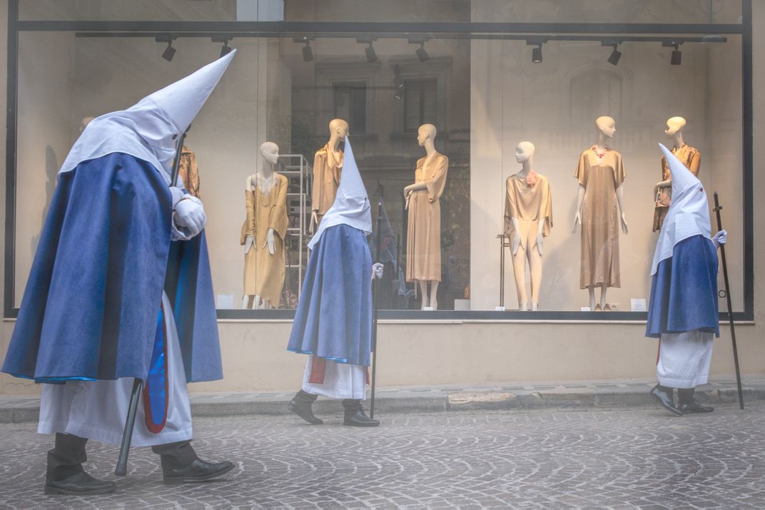 Silent procession before motionless silhouettes: when ancient fervour meets modern fashion, and the street becomes the stage for a strange ball.