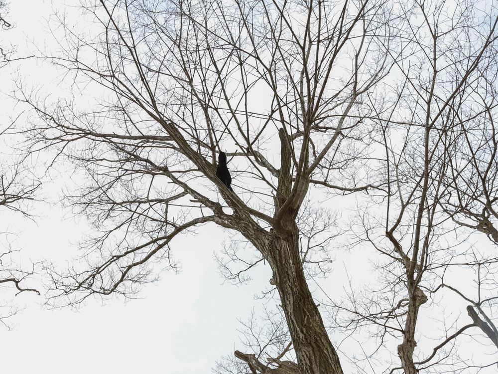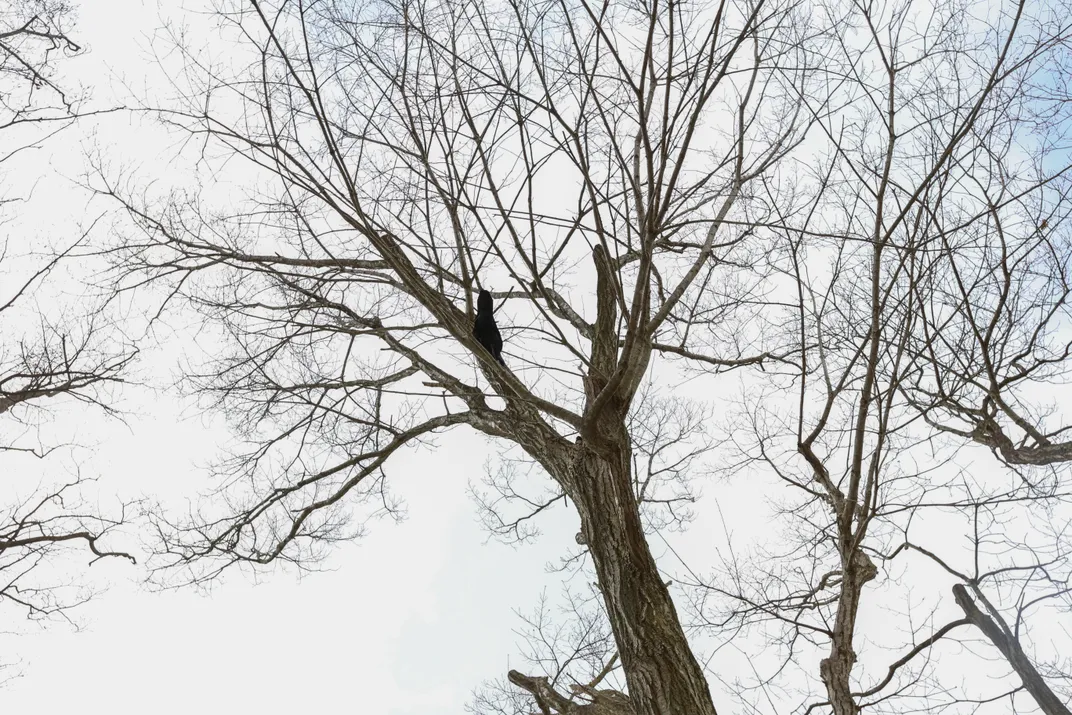 A solitary crow perches on the bare, chaotic branches of a winter tree in Japan. The stark contrast between the black bird, the dark branches, and the overcast white sky creates a minimalist scene that embodies the quiet solitude of the season.