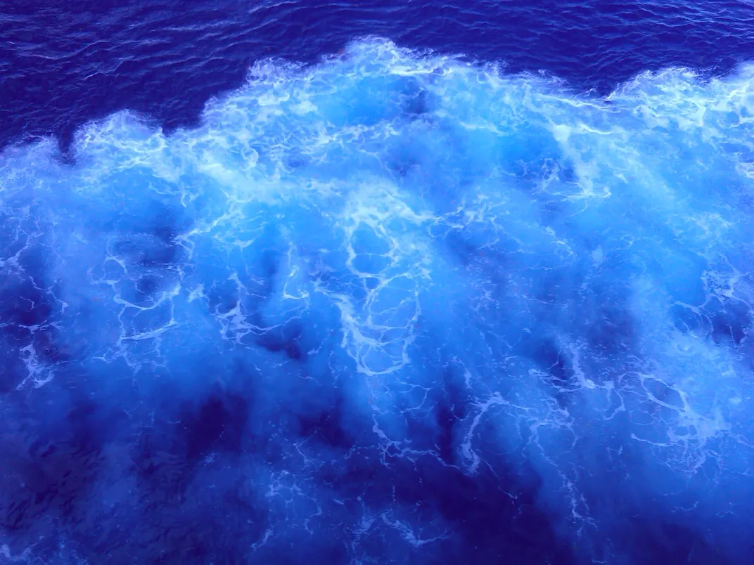 The water in the Caribbean Sea is the most amazing deep cobalt blue. The wake from a cruise ship stirs the sea, creating the most beautiful turquoise ripples.