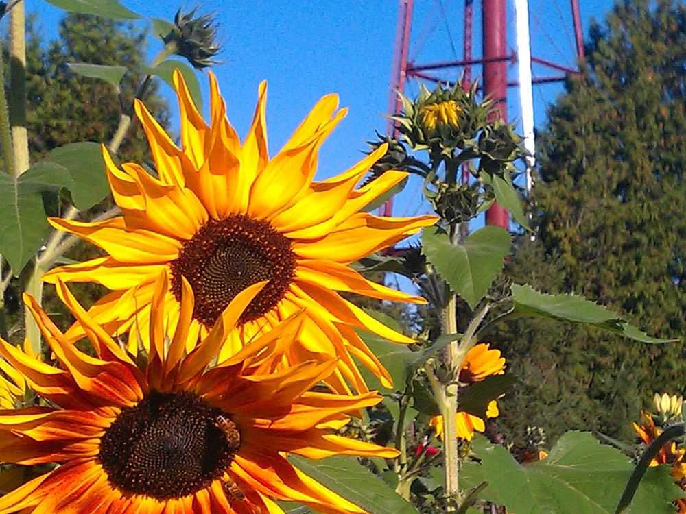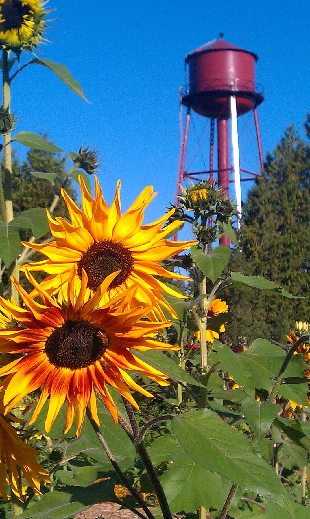 The water tower overlooks the bright sunflowers sought out by bumblebees in the garden of the McMenimins Edgefield Inn, restored grounds once housing a Poor Farm and later a Reformatory School in Troutdale, Oregon.