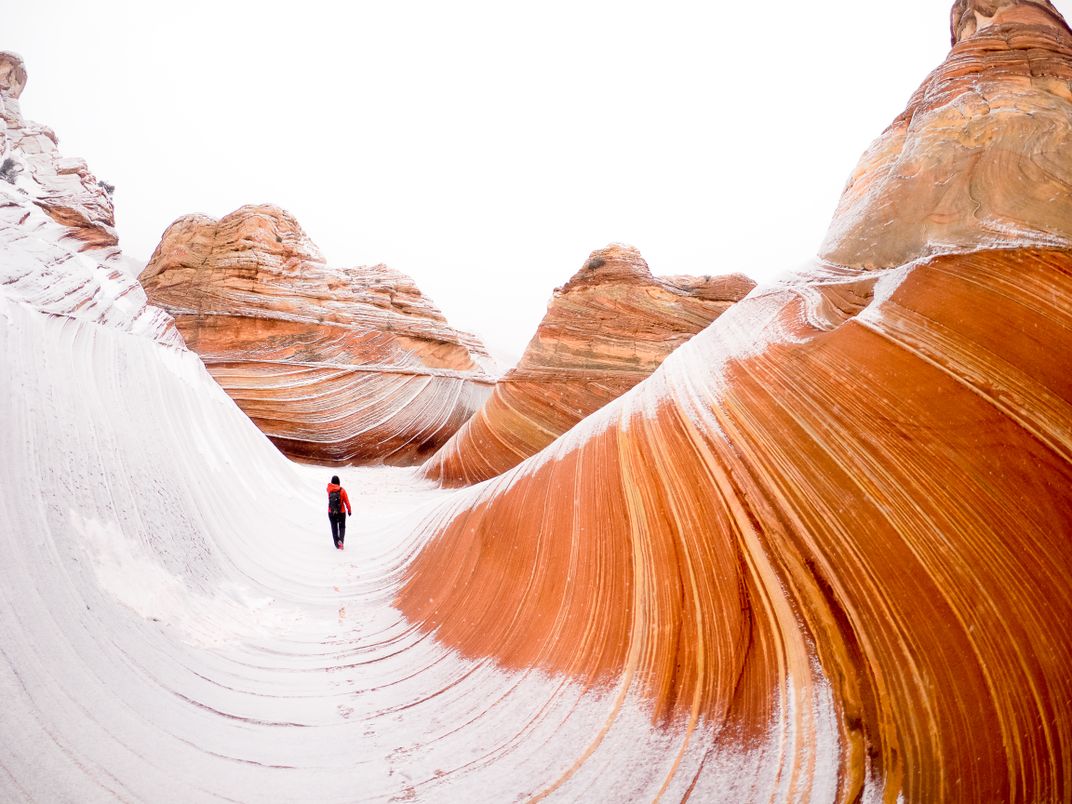 This is The Wave in Coyote Buttes in Arizona, an iconic land mark in Southwest. Experiencing that magical formation in winter made the experience even more surreal.