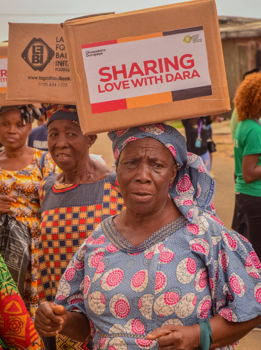 In Lagos, Nigeria, a widow carries a care package home during a community outreach event. Organized to celebrate a 40th birthday ("Sharing Love with Dara"), the initiative turned a personal milestone into a lifeline for local mothers and widows. Her expression captures the quiet dignity of resilience and the deep appreciation for community support in challenging economic times.