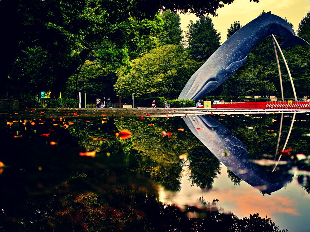 In that September, there were a lot of downpours in Tokyo. One day, just after another heavy rain, I went to a park to get fresh air. There is one museum where I used to go frequently when I was small. It has a life-size model of a blue whale as its landmark. I was always amazed by that whale, it made an impression on my child heart as a creature from a fantasy world. When I passed by that museum after the rain, I found that there was a large puddle in front of the museum, and it seemed the whale was diving into the puddle. With my childhood memory's coming back, I felt that I was in a tale.