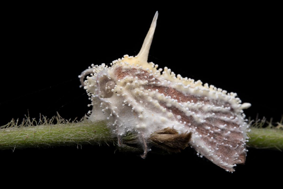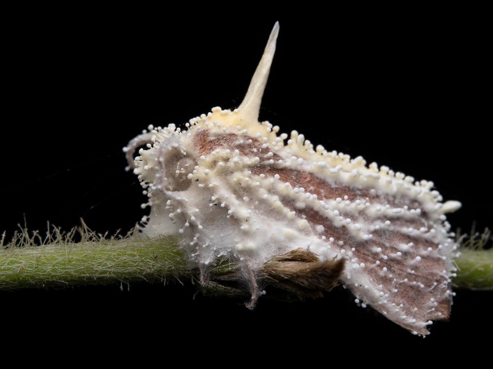 In the stillness of the forest floor, a white moth becomes the vessel of new life. The Cordyceps fungus blooms in silence — beauty born from decay.